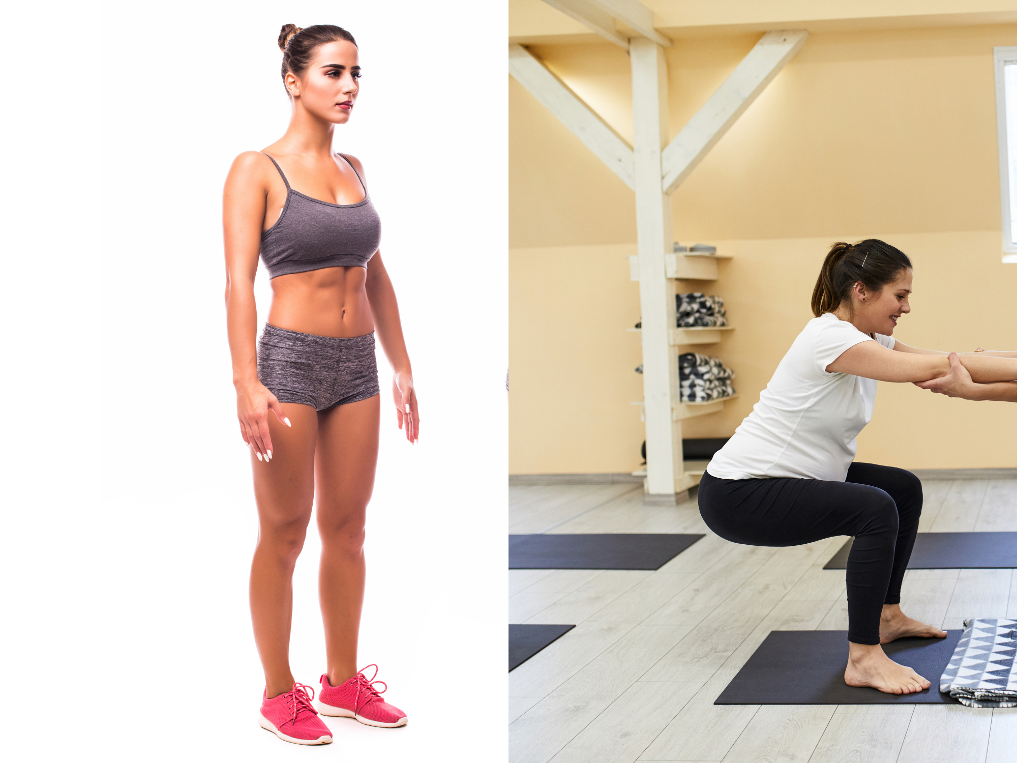 – Từ từ hạ người xuống, giữ tư thế như đang ngồi trên ghế. Chú ý : trọng lượng dồn về gót chân, thả lỏng 2 vai.