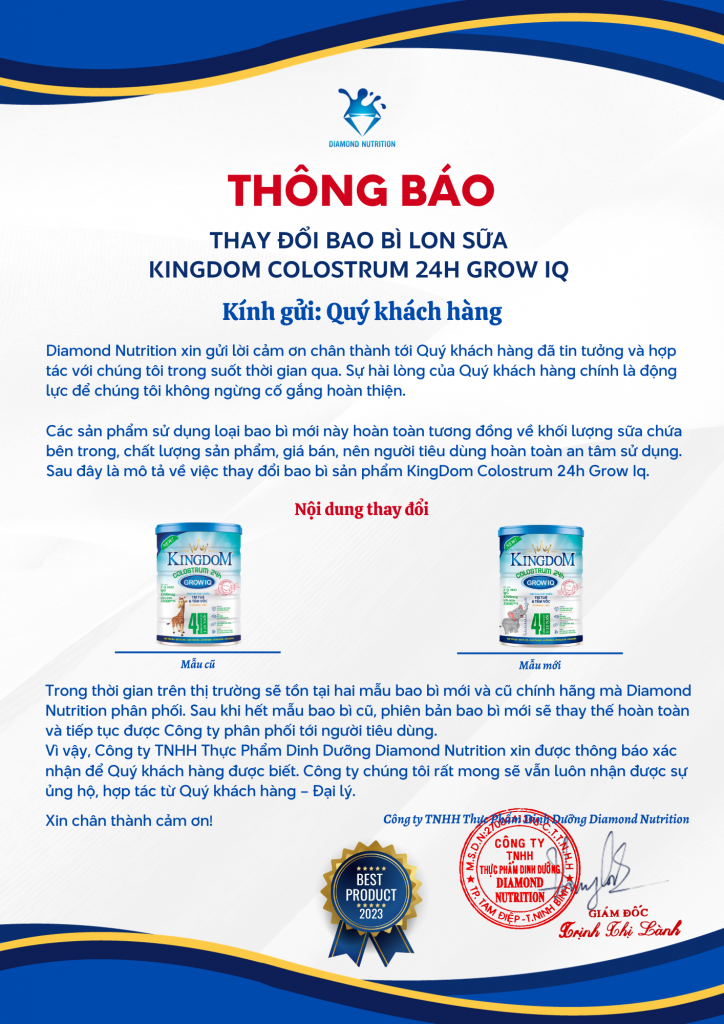Nhằm duy trì và nâng cao chất lượng sản phẩm, Diamond Nutrition đã nghiên cứu xét thấy cần thay đổi mẫu mã bao bì của sản phẩm dinh dưỡng KingDom Colostrum 24h Grow Iq – hỗ trợ phát triển trí não và tầm vóc, để hoàn thiện nhận diện giúp khách hàng chọn mua sản phẩm chính hãng, và vận chuyển sản phẩm đến tay khách hàng trọn vẹn nhất.