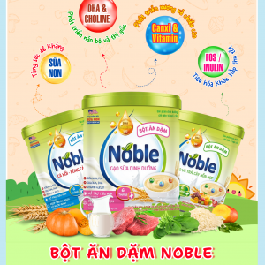 Bột ăn dặm Noble Bò – Chùm Ngây dành cho trẻ từ 06 – 24 tháng tuổi. Là thức ăn thơm ngon giàu dinh dưỡng cho bé bắt đầu ăn dặm. Với hương vị thơm ngon, giàu đạm, sắt từ thịt bò và vi chất dinh dưỡng từ lá chùm ngây giúp kích thích vị giác, bé ăn ngon miệng, phát triển thể chất toàn diện. Sản phẩm mềm mịn, dễ tiêu hóa, bổ sung vitamin, khoáng chất giúp tăng sức đề kháng, trẻ phát triển toàn diện cả về thể chất lẫn trí tuệ.