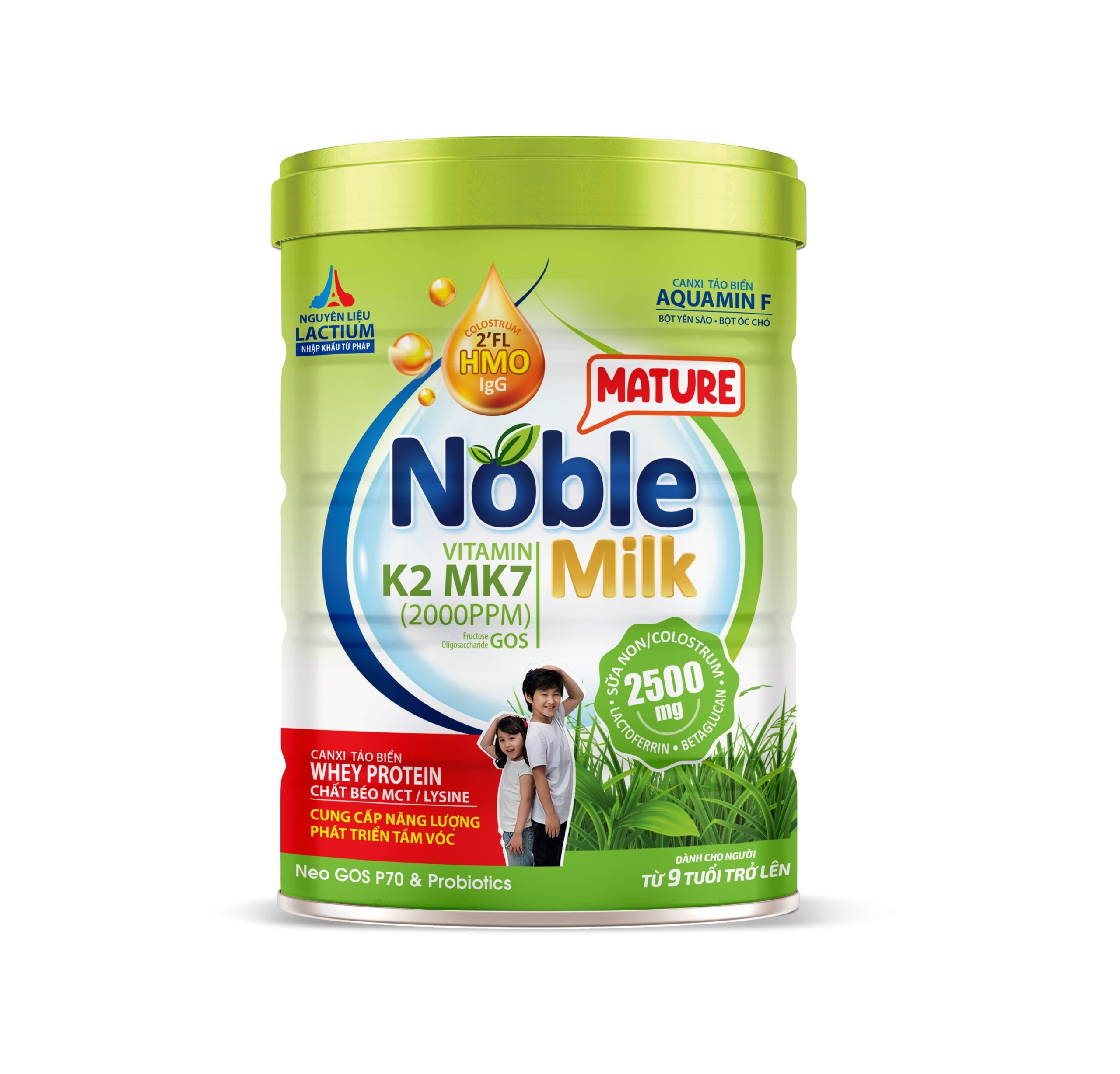 Ngoài ra, ba mẹ có thể bổ sung thêm sữa vào thực đơn mỗi ngày cho trẻ. Sữa Noble Milk Mature Là sản phẩm giàu dinh dưỡng và cao năng lượng, hỗ trợ hệ tiêu hóa giúp hấp thu tối ưu, cải thiện chiều cao và cân nặng, tăng sức đề kháng, giúp trẻ ăn ngon miệng và có giấc ngủ tốt. Cho con bắt kịp đà tăng trưởng,vững bước vào tương lai.